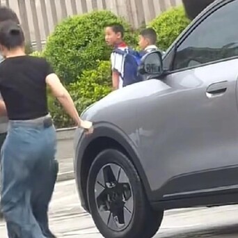 可是,他越是拍打对方越是不配合,一气之下,于是保安就猛力的踢踹车门和轮胎,想逼女家长下车。